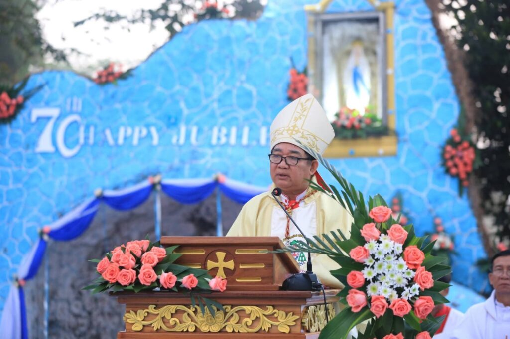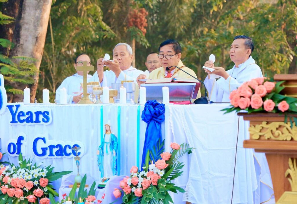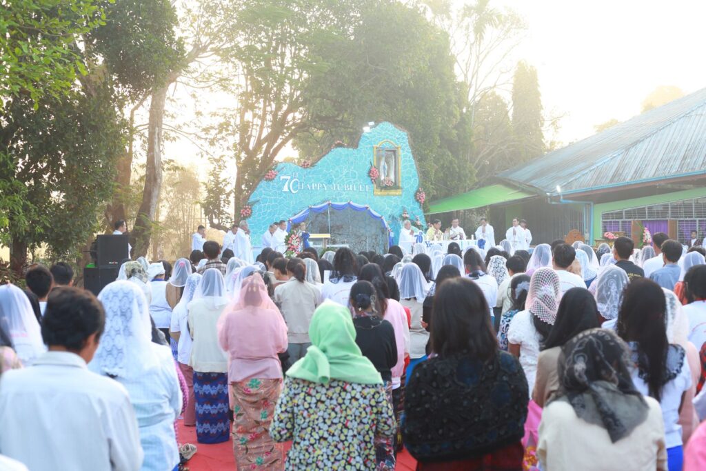 The Platinum Jubilee Mass was held at the Marian Grotto in Mayanchaung, Pathein. Bishop Henry Eikhlein of Pathein Diocese presided, joined by 11 concelebrating priests. Religious sisters, novices, and hundreds of faithful joined the 6:00 a.m. celebration.
