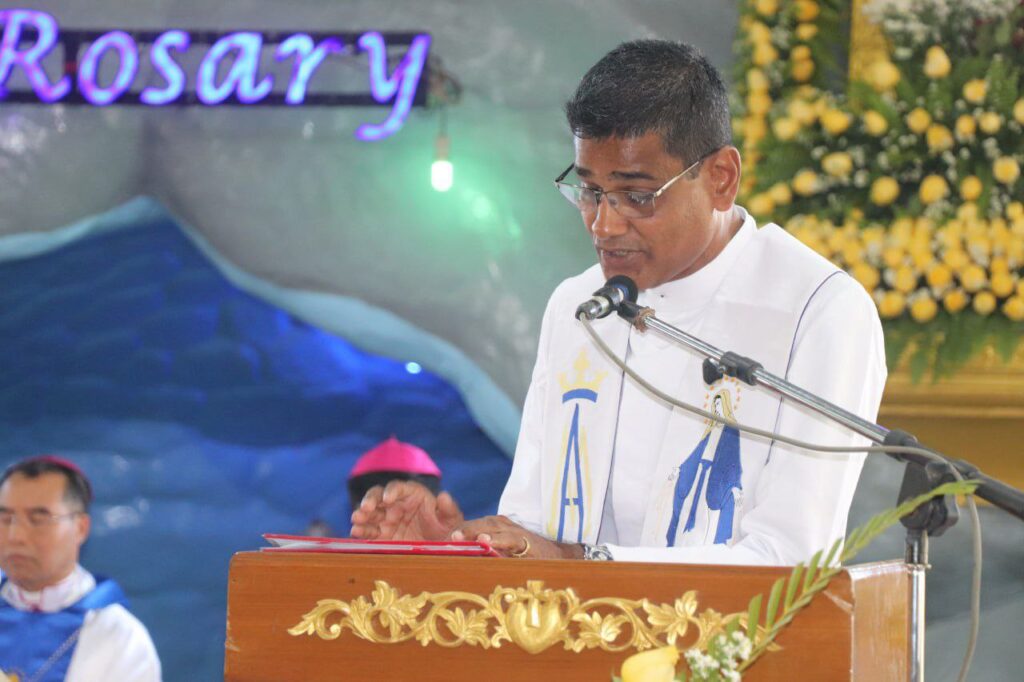Rev. Fr. Stanislaus, parish priest of Nyaunglebin Marian Shrine delivers words of thanks (Photo by RVA Sgaw Karen)