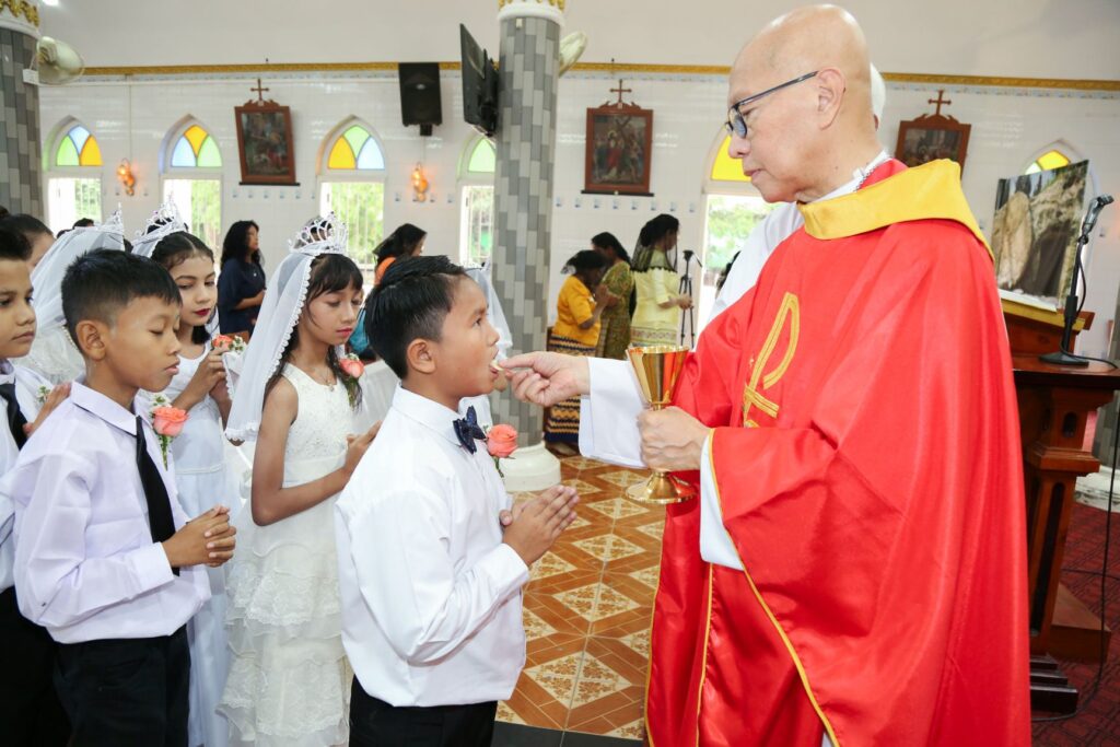Archbishop Marco Tin Win giving the First Holy Communion at St. Michael’s Church, Mandalay (Photo by RVA Myanmar)