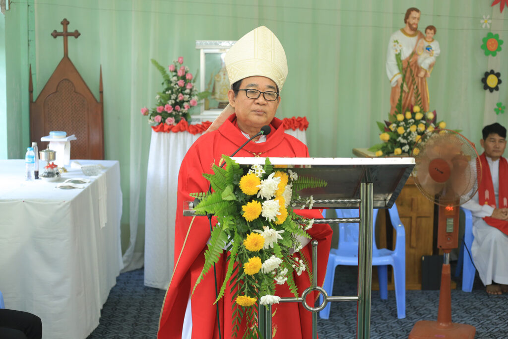 Bishop Henry Eikhlein of Pathein Diocese is delivering the homily (Photo by RVA Pwo Karen)