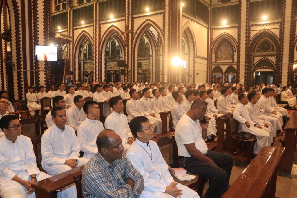 High-ranking church officials, including the Papal Representative to Myanmar, Msgr. Andrea Ferrante, His Excellency Bishop Noel Saw Naw Aye, and His Excellency Bishop Raymond Wai Lin Htun, the Auxiliary Bishops of Yangon, and Bishop Peter Tin Wai of Pyay Diocese concelebrated the celebration. The congregation also included numerous priests, over a hundred seminarians, and religious men and women from various congregations.