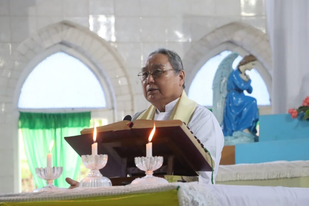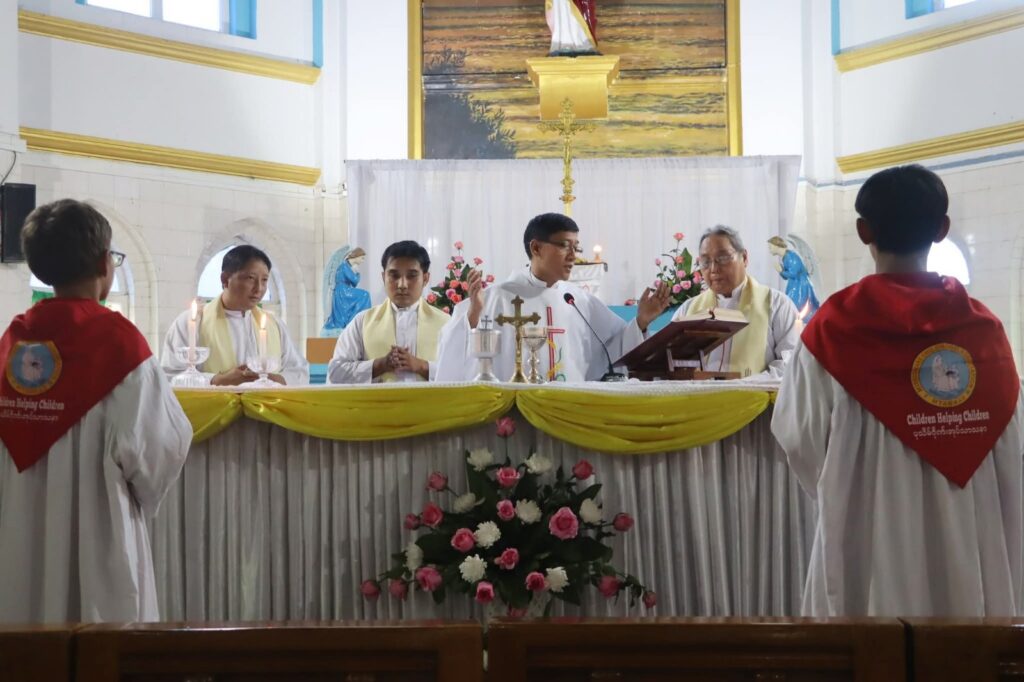 The Eucharistic celebration, which gathered 141 children for the 7:00 am service, was presided over by Fr. Cyril Win Mg, the diocesan director of the Pontifical Mission Society. He was concelebrated by the parish priest, Fr. Raymond Htun Kyi, assistant priest Fr. Sylvester Eden Oo, and Fr. Francis Min Min Htun, the diocesan youth director.