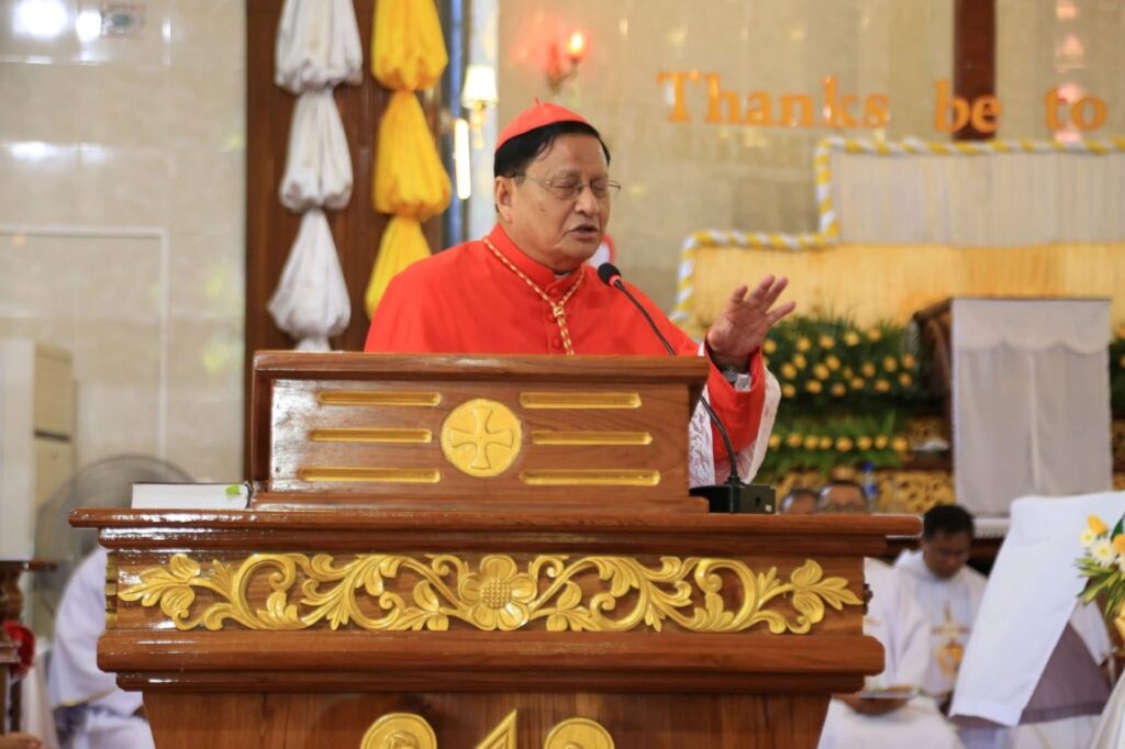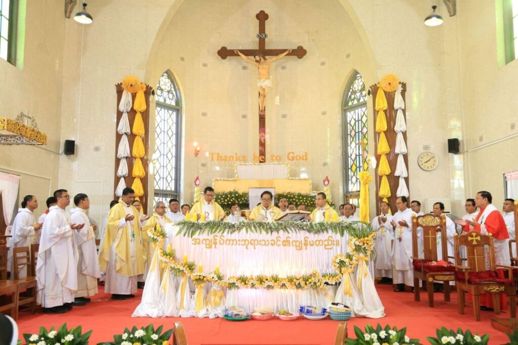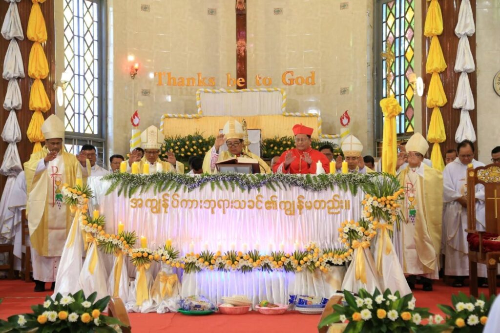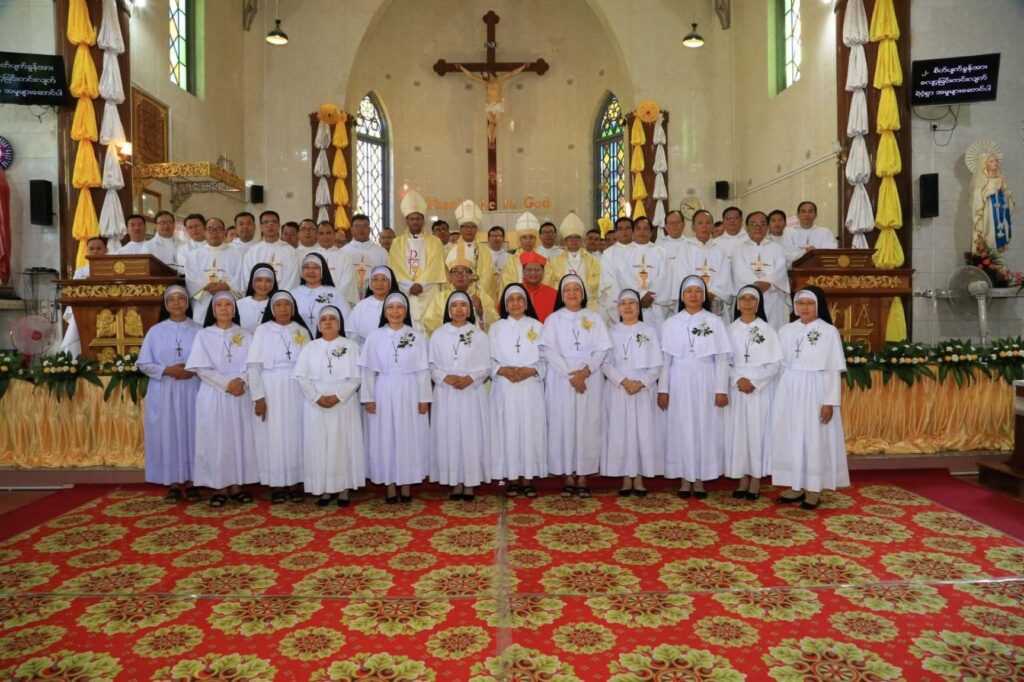 The morning ceremony, which drew a large congregation, recognized five sisters celebrating 50 years of religious life (Golden Jubilee) and nine sisters marking 25 years (Silver Jubilee). The Mass was presided over by Bishop Henry Eikhlein of Pathein Diocese and concelebrated by His Eminence Cardinal Charles Bo of Yangon Archdiocese, alongside several auxiliary bishops.