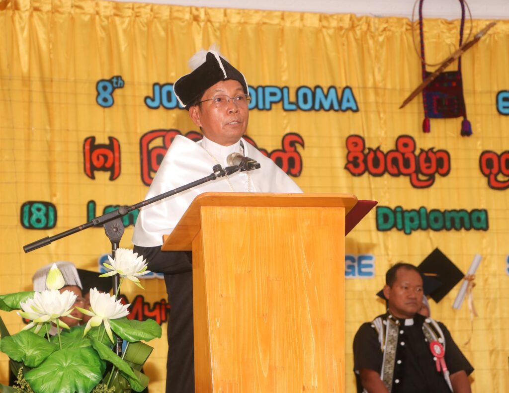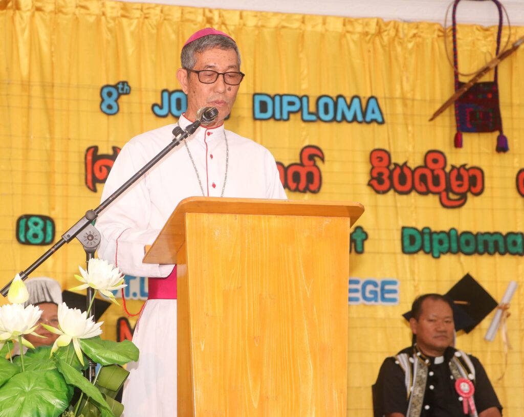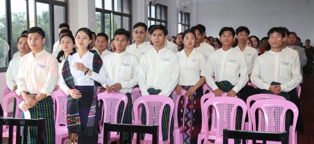 Before the graduation ceremony, a Thanksgiving Mass was celebrated. Bishop John Mung Ngawn La Sam of Myitkyina Diocese presided. He was joined by Bishop Raymond Sumlut Gam of Banmaw Diocese and Bishop Francis Daw Than, along with many priests, religious sisters, and lay faithful.