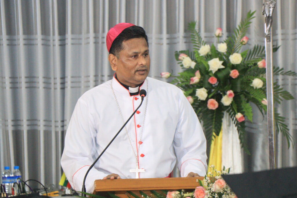 His Excellency Bishop Raymond Wai Lin Htun delivers a speech (Photo by RVA Sgaw Karen)