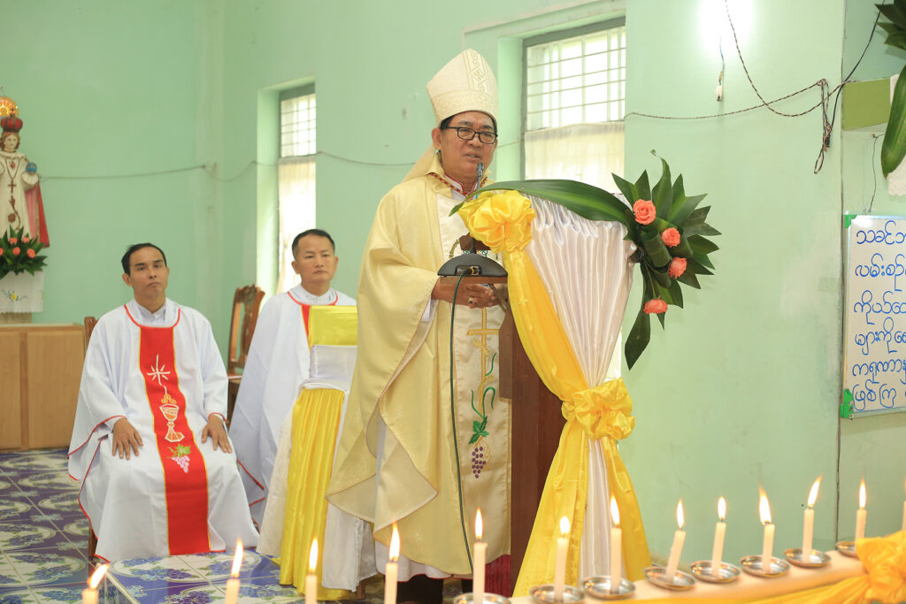He was concelebrated by the current parish priest, Fr. John Ko Ko, and Fr. Peter Saw Ngwe, alongside religious sisters, catechists, and a large assembly of the faithful.